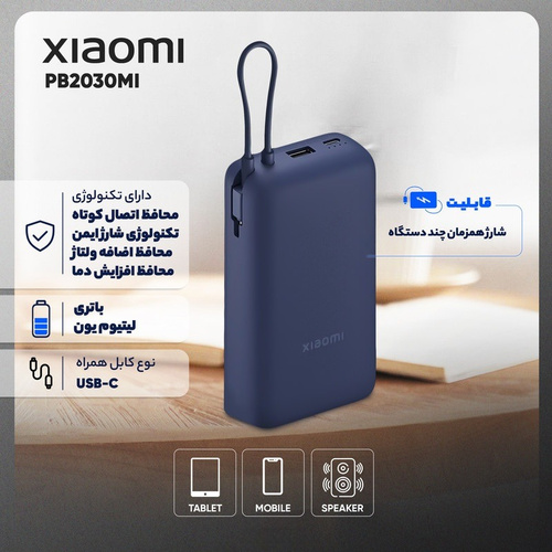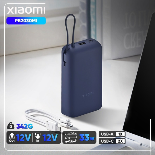 پاوربانک شیائومی مدل PB2030MI با ظرفیت 20000mAh و توان خروجی 33 وات، دارای کابل USB-C داخلی، شارژ سریع دوطرفه، چند خروجی برای شارژ همزمان و ایمنی چندلایه – بهترین انتخاب برای گوشیها، تبلتها و گجتهای هوشمند شما. قابل حمل و مناسب سفر. خرید با قیمت مناسب!